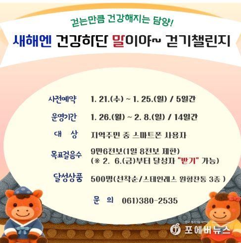 [ 포에버뉴스 오명숙 기자 ] 담양군은 2026년 새해를 맞아 오는 1월 26일부터 2월 8일까지 온라인 걷기 챌린지 ‘새해엔 건강하단 말이야’를 운영한다고 밝혔다.