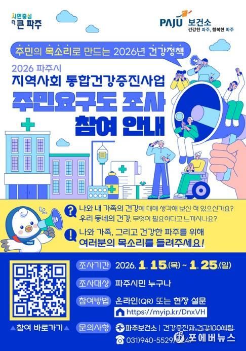 [ 포에버뉴스 김경순 기자 ] 파주시는 시민의 건강한 삶을 지원하기 위해 '2026년 지역사회 통합건강증진사업’추진에 앞서 주민건강요구도 조사를 실시한다.