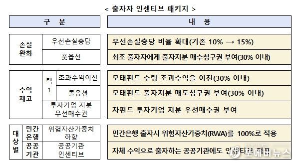지역사회가 참여하는 모펀드별 ‘운영위원회’를 설치하고 지역투자 재원 확보를 위해 출자자 인센티브 패키지를 제공한다. 인센티브는 손실은 낮게, 수익은 높게, 대상은 넓게 설정한다. 지역 기반 벤처캐피탈 육성을 위한 지역운용사 인센티브도 운영할 계획이다.