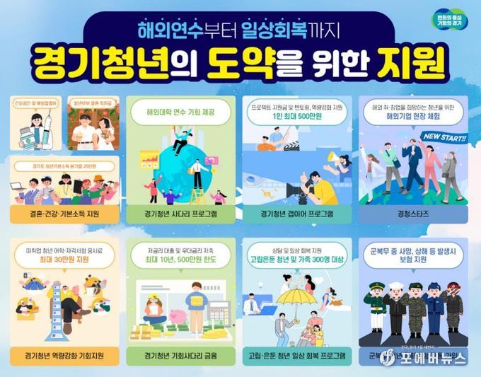 [ 포에버뉴스 김경순 기자 ] 경기도가 올해 청년들을 위한 건강검진비와 예방접종비를 최대 20만 원까지 지원한다. 청년들에게 해외연수 기회를 제공하는 청년사다리, 해외취업을 위한 경청스타즈, 진로설계를 지원하는 갭이어 사업, 만 24세 경기도 청년에게 연간 최대 100만 원, 분기별 지역화폐를 지원하는 경기도 청년기본소득은 올해도 계속된다. 청년들의 경제적 부담을 덜어주기 위한 어학이나 자격시험 응시료 지원, 금융지원뿐 아니라, 고립은둔청년 지원, 군복무 청년 상해보험 가입도 있다. 청년들의 현재와 미래를 위한 정책이다.