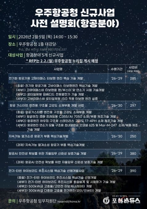 [ 포에버뉴스 사공선 기자 ] 우주항공청은 2월 5일 오후 2시, 사천 우주항공청 1층 대강당에서 2026년 항공분야 신규사업의 주요 내용을 공유하고, 산·학·연 연구자의 적극적인 참여와 심도 있는 이해를 돕기 위한 사전설명회를 개최한다고 밝혔다.