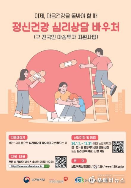 [ 포에버뉴스 방미정 기자 ] 원주시는 우울·불안 등 정서적 어려움이 있는 시민들이 심리 상담 서비스를 받을 수 있도록 ‘2026년 정신건강 심리상담 바우처사업’ 이용자를 모집한다.