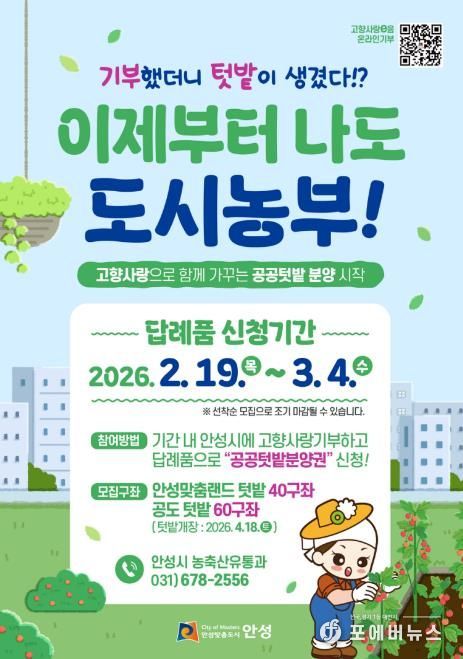 [ 포에버뉴스 김경순 기자 ] 안성시는 오는 2월 19일부터 고향사랑기부제를 통해 도시농업을 체험하는 ‘도시농부’를 모집한다고 밝혔다.