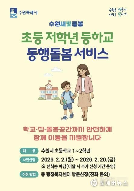 수원시 관계자는 “새 학기가 시작되자마자 시민들이 불편 없이 서비스를 이용할 수 있도록, 사전 신청 기간을 운영한다”며 “등하교 등하교 동행돌봄 서비스가 맞벌이 가정, 긴급하게 자녀 돌봄이 필요한 시민들에게 도움이 되길 바란다”고 말했다.