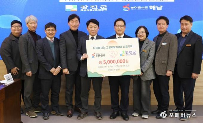 [ 포에버뉴스 오명숙 기자 ] 강진군과 해남군이 지난 6일, 고향사랑기부금 각 500만 원을 상호 기부하며 두 지자체 간 상생 발전과 고향사랑기부제 활성화를 위한 뜻을 모았다.