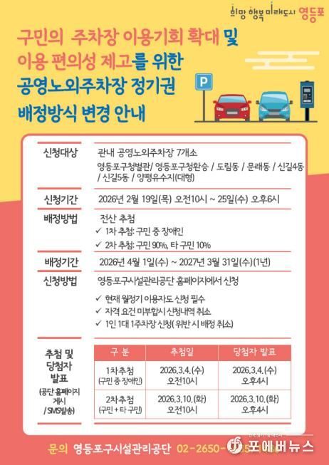 [ 포에버뉴스 김경순 기자 ] 영등포구가 관내 공영노외주차장 7개소에 대한 정기권 신청을 ‘선착순 순환배정제’에서 ‘구민 우선 전산추첨 순환배정제’로 변경해 오는 19일부터 25일까지 접수한다고 밝혔다.