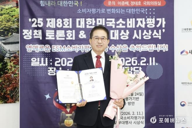 [ 포에버뉴스 김경순 기자 ] 지난 11일, 국회 도서관에서 열린 2026 제8회 ESM대한민국소비자평가우수대상 정책토론회 및 시상식에서 광주시의회 허경행 의장이 지방자치/행정 부문 대상을 수상했다.