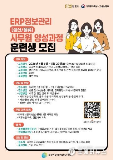 [ 포에버뉴스 김경순 기자 ] 김포여성새로일하기센터는 지역 산업 수요에 부합하는 전문 인력 양성과 경력보유 여성의 안정적인 취업 지원을 위해 '전사적 자원관리(ERP) 생산·물류 사무원 양성 과정' 훈련생을 모집한다.