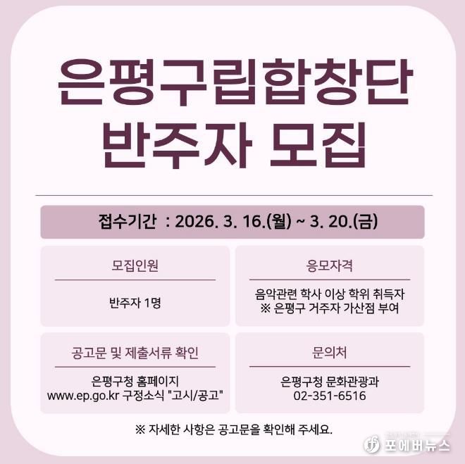 [ 포에버뉴스 김경순 기자 ] 서울 은평구는 오는 16일부터 20일까지 은평구립합창단 피아노 반주자 1명을 공개 모집한다고 밝혔다.