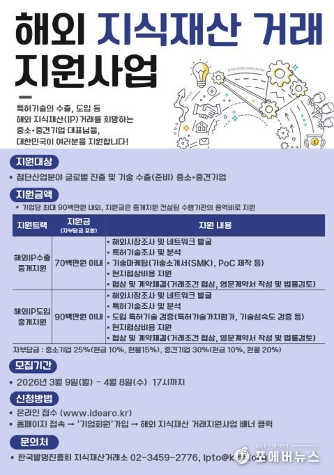 [ 포에버뉴스 사공선 기자 ] 지식재산처는 3월 9일~4월 8일까지 2026년 ‘해외 지식재산 거래 지원 사업’ 참여 기업을 신규 모집한다고 밝혔다.
