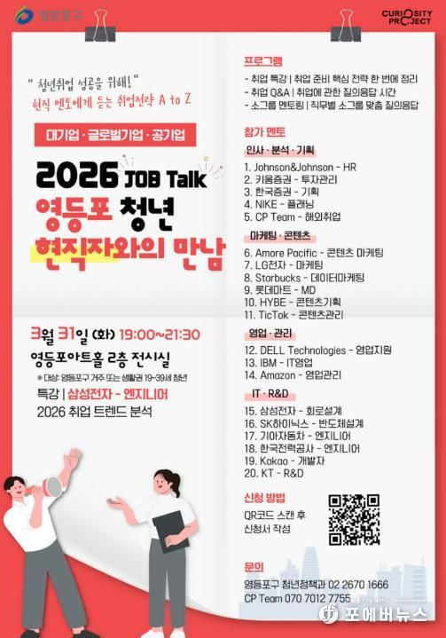 행사는 오는 31일 영등포아트홀 2층 전시실에서 열린다. 신청 대상은 19~39세 영등포구 거주 및 생활권 청년이며, 모집인원은 250명이다. 포스터 내 정보무늬(QR코드)를 통한 사전 신청이 원칙이나, 신청 상황에 따라 당일 현장 접수도 가능하다. 자세한 내용은 구청 누리집 ‘우리구소식’ 또는 ‘영등포 청년 네이버 카페’에서 확인할 수 있다.