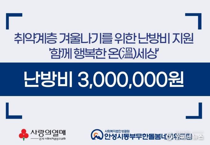 [ 포에버뉴스 김경순 기자 ] 안성시동부무한돌봄네트워크팀은 이달 초, 경기사회복지공동모금회 지정기부금을 활용해 취약계층의 따뜻한 겨울나기를 돕는 ‘함께 행복한 온(溫)세상’ 사업을 진행했다.