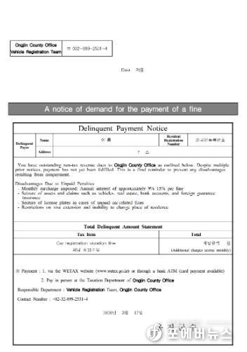[ 포에버뉴스 김경순 기자 ] 옹진군이 자동차 과태료 외국인 체납자들을 대상으로, 영어로 번역된‘자동차 과태료 체납 안내문’을 발송한다고 밝혔다.