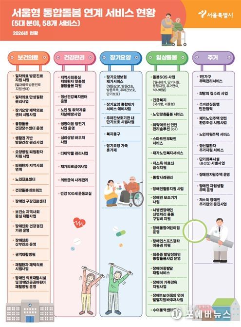 ‘서울형 통합돌봄’은 돌봄 필요 노인(고령 장애인 포함)과 65세 미만 심한 장애인(지체, 뇌병변) 대상 보건의료, 건강, 장기요양, 일상돌봄, 주거, 5개 분야 총 58개 서비스를 연계·제공하는 제도로 시는 통합돌봄 비해당 대상자를 예비적 통합돌봄 대상으로 관리하고 6개월마다 모니터링, 필요시 돌봄서비스를 연계할 계획이다. 본인 또는 가족이 구·동 주민센터를 통해 한 번만 신청(긴급 지원 필요 시 자치구 직권 신청)하면 담당 공무원 등이 방문, 사전 조사 및 종합판정 조사, 개인별 지원계획 수립, 통합 지원회의를 거쳐 서비스를 제공받게 된다.