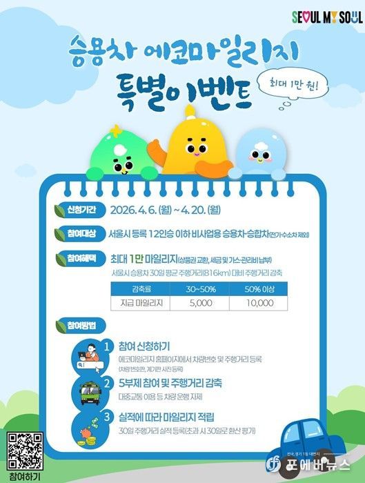 수송(승용차) 분야 특별 이벤트는 4월 6일~20일 에코마일리지 홈페이지에서 차량번호·주행거리를 등록해 신청한 뒤, 4~5월 중 30일간 자발적 5부제 참여와 주행거리 감축을 이행하면 최대 1만 마일리지를 받을 수 있다. 정기 승용차 마일리지 참여 시민 역시 이번 특별 이벤트에 참여할 수 있다.