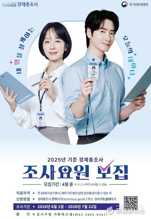 [ 포에버뉴스 김경순 기자 ] 서울 강서구는 올해 6월부터 전국적으로 시행되는 ‘2025년 기준 경제총조사’를 위해 오는 23일까지 조사요원 115명을 모집한다고 밝혔다.