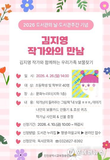 행사는 4월 26일 행사 오후 2시에 진행되며, 참여 신청은 4월 10일 오전 10시부터 중앙도서관 누리집에서 접수한다. 자세한 사항은 독서문화과로 문의하면 된다.
