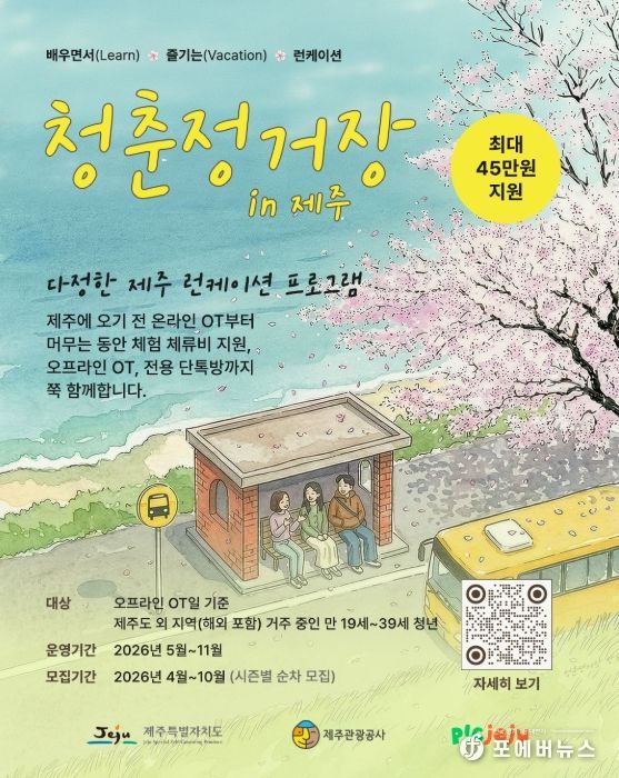[ 포에버뉴스 사공선 기자 ] 제주특별자치도와 제주관광공사(사장 고승철)는 오는 5월 3일까지 제주인구정책 통합플랫폼을 통해 도외 거주 청년을 대상으로 제주에서 배우며 방학을 즐길 런케이션 참가자를 모집하고 있다고 17일 밝혔다.