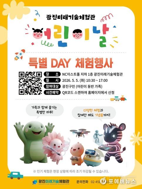 [ 포에버뉴스 김경순 기자 ] 광진미래기술체험관은 오는 5월 5일 어린이날을 맞아 가족과 함께 즐길 수 있는 ‘광진미래기술 체험데이’를 개최한다.