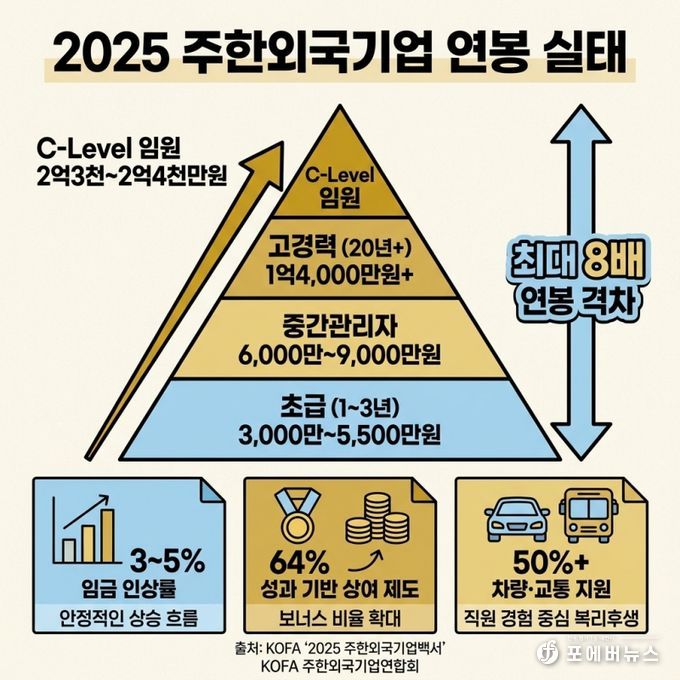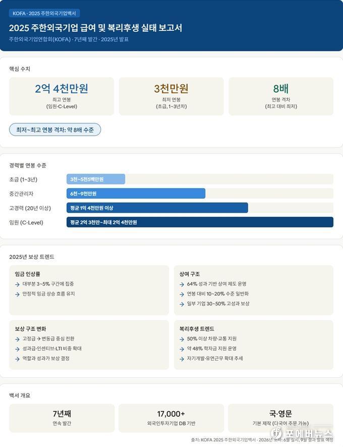 [ 포에버뉴스 김경순 기자 ] 주한외국기업연합회(상임대표 김종철, KOFA)는 ‘2025 주한외국기업백서’ 혁신판을 발표하고, 작년 6월 실시한 주한외국기업 급여 및 상여금 실태조사와 함께 복리후생 조사 결과를 포함해 공개했다. 이번 백서는 7년째 발간되는 자료로, 기존 조사 대비 한층 고도화된 분석 체계를 적용해 글로벌 전문 조사기관 수준의 HR 리포트로 업그레이드됐다는 평가를 받고 있다.