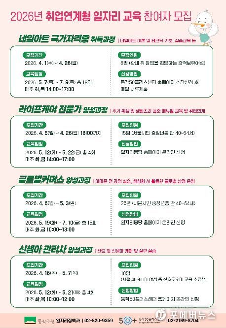 박일하 동작구청장은 “구민들이 교육을 넘어 실제 취업으로 이어지는 성과를 체감할 수 있도록 취업 연계 중심의 일자리사업을 확대했다”며, “앞으로도 구민의 든든한 일자리 파트너로서 직무 교육부터 취업 연계, 사후 관리까지 체계적으로 지원하겠다”고 말했다.