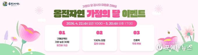 [ 포에버뉴스 김경순 기자 ] 옹진군은 5월 가정의 달을 맞아 지역 특산물 온라인 판로 확대와 옹진자연몰 이용 활성화를 위해 ‘2026년 옹진자연 가정의 달 맞이 이벤트’를 오는 4월 22일부터 5월 20일까지 총 29일간 운영한다고 밝혔다.