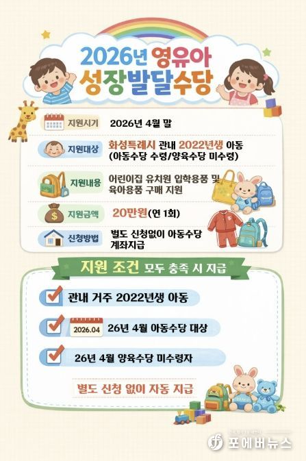 [ 포에버뉴스 김경순 기자 ] 화성특례시는 어린이집 및 유치원 입학 초기 영유아 가정의 양육 부담을 덜고 아동의 건강한 성장을 지원하기 위해 ‘2026년 영유아 성장발달수당’을 지급한다고 밝혔다.