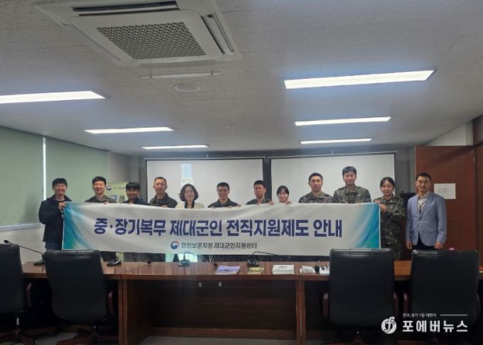 [ 포에버뉴스 김경순 기자 ] 국가보훈부 인천보훈지청 제대군인지원센터는 4월 22일 육군 제17보병사단 5년 이상 복무한 중장기복무 전역예정군인을 대상으로 ‘제대군인 전직지원 사업 홍보를 위한 찾아가는 군부대 순회교육’을 실시 했다. ‘찾아가는 군부대 순회교육’은 제대군인지원센터가 각 군부대와의 협조를 통해 교육 접근성과 참여율을 높이기 위해 군부대 내에서 직접 제대예정군인 전직지원제도와 국가보훈제도를 소개하는 프로그램이다.