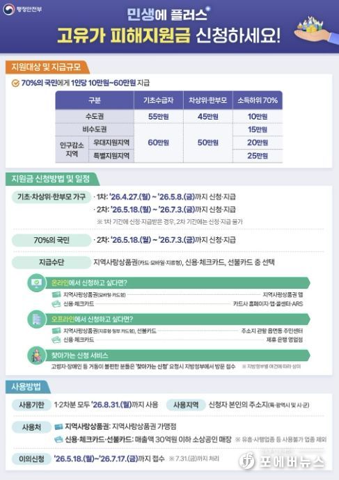[ 포에버뉴스 사공선 기자 ] 청주시는 고유가·고물가로 인한 시민 부담을 완화하고 지역 경제 회복을 지원하기 위해 오는 27일부터 ‘고유가 피해지원금’ 1차 신청·지급을 개시한다고 밝혔다.