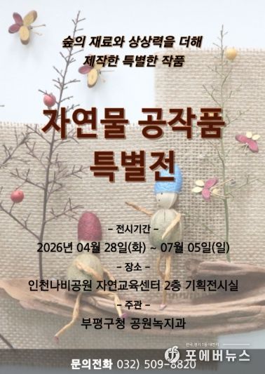 [ 포에버뉴스 김경순 기자 ] 부평구는 부평숲 인천나비공원에서 오는 28일부터 ‘자연물 공작품 특별전’을 개최한다고 밝혔다.