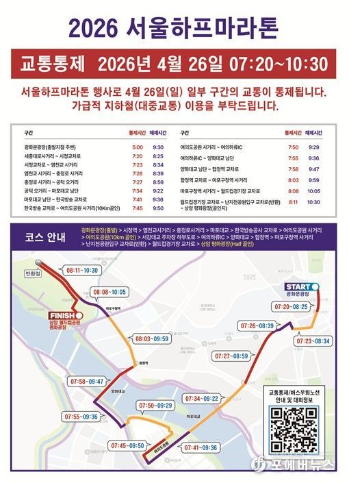 [ 포에버뉴스 김경순 기자 ] 서울시는 4월 26일 오전 7시 30분 광화문광장을 출발해 여의도공원과 상암 월드컵공원으로 이어지는 ‘2026 서울하프마라톤대회’를 개최한다.