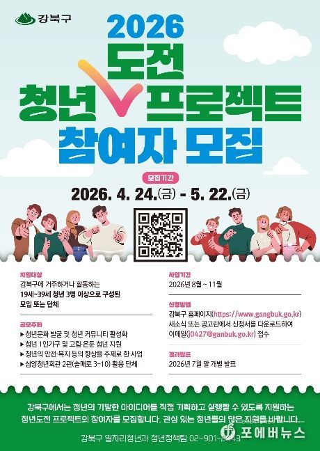 [ 포에버뉴스 김경순 기자 ] 서울 강북구는 청년들의 창의적인 아이디어를 지역사회에서 실현할 수 있도록 돕는 ‘2026년 청년도전 프로젝트’ 참여자를 모집한다고 밝혔다.