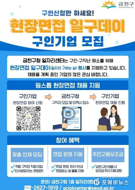 [ 포에버뉴스 김경순 기자 ] 금천구는 구인·구직난을 해소하고, 기업의 원활한 채용을 지원하기 위해 ‘현장면접 일구데이’ 참여 기업을 상시 모집한다고 밝혔다.