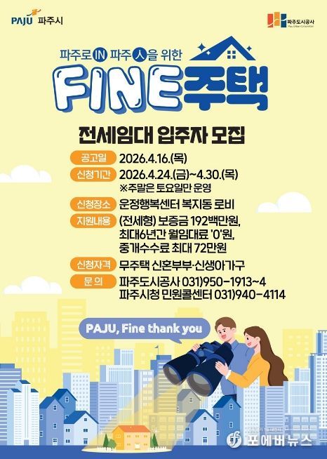 [ 포에버뉴스 사공선 기자 ] 파주시는 신혼부부와 신생아 가구의 주거비 부담 완화를 위해 ‘파인(FINE)주택’전세임대 입주자 신청을 24일부터 받는다.