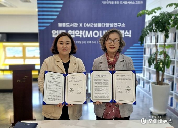 [ 포에버뉴스 김경순 기자 ] 파주시 월롱도서관은 지난 22일 디엠지(DMZ)생물다양성연구소와 지역사회 독서진흥 및 생태환경 분야 협력을 위한 업무협약을 체결했다.
