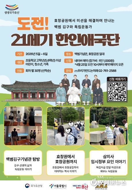 [ 포에버뉴스 김경순 기자 ] 서울 용산구가 내달부터 11월까지 지역 내 국가유산 서울 효창공원(효창원로 177-18) 일대에서 ’효창공원이 생생, 독립운동이 생생‘ 프로그램을 운영한다.