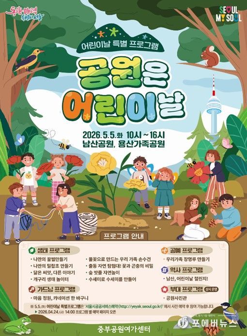 어린이날 특별프로그램은 4월 24일 14시부터 서울시공공서비스예약 누리집을 통해 참여 신청이 가능하며, 자세한 내용은 중부공원여가센터 공원여가과로 문의하면 된다.