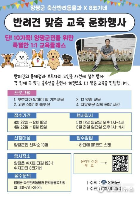 이번 교육은 양평 쉬자파크에서 5월 17일과 6월 21일 오후 1시부터 4시까지 진행되며, 회차별 사전 신청을 통해 선정된 10팀씩 총 20팀을 대상으로 운영된다. 특히 양평군 홍보대사이자 45만 구독자를 보유한 유튜브 채널 ‘8코기네’의 전승우 훈련사와 반려견 행동전문가 10명이 참여해 일대일 맞춤형 야외 실습과 현장 교정 지도를 제공할 예정이다.