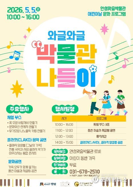 [ 포에버뉴스 김경순 기자 ] 안성맞춤박물관은 오는 5월 5일 어린이날을 맞아, 온 가족이 함께 즐길 수 있는 문화 프로그램 ‘와글와글 박물관 나들이’를 개최한다고 밝혔다.