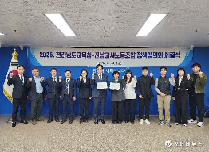 [ 포에버뉴스 오명숙 기자 ] 전라남도교육청과 전남교사노동조합(위원장 김신안)은 24일 전라남도교육청 중회의실에서 ‘2026년도 정책협의회 체결식’을 갖고, 건강한 교육 생태계 조성을 위한 공동의 노력을 약속했다.