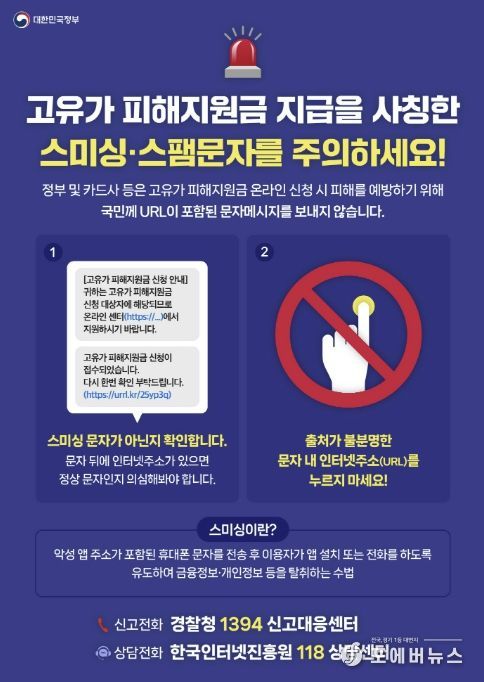 한편, 시는 ‘고유가 피해지원금 지급’을 사칭한 스미싱 문자에 대해 각별한 주의를 당부했다. 고유가 피해지원금은 카드사 또는 지역화폐 공식 앱이나 누리집(홈페이지), 오프라인에서만 신청이 가능하다. 특히 공공기관에서는 고유가 피해지원금과 관련된 인터넷 주소(URL) 링크 연결을 유도하는 문자를 보내거나 전화하지 않는다고 강조했다.