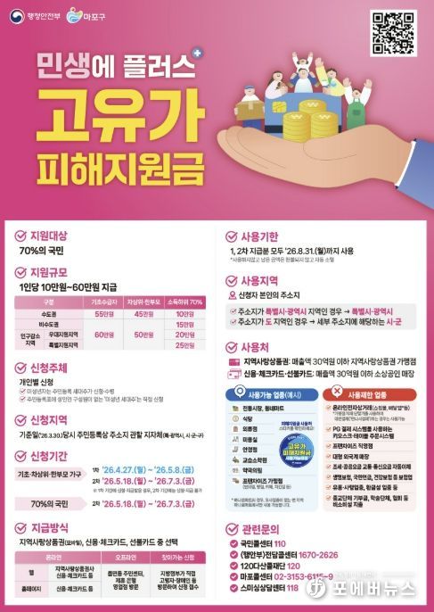 [ 포에버뉴스 사공선 기자 ] 마포구는 중동 전쟁 여파로 이어진 고유가·고물가 상황 속에서 구민의 경제적 부담을 덜고 지역경제에 활력을 불어넣기 위해 ‘고유가 피해지원금’을 지급한다.