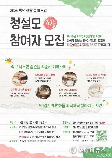 유유기지 부평 관계자는 “청설모는 청년들이 자신의 생활을 주도적으로 설계하고, 기록을 통해 변화를 체감할 수 있도록 돕는 프로그램”이라며 “이번 4기 역시 참여자들이 일상의 작은 실천을 통해 스스로의 변화를 발견하는 계기가 되길 바란다”고 말했다.