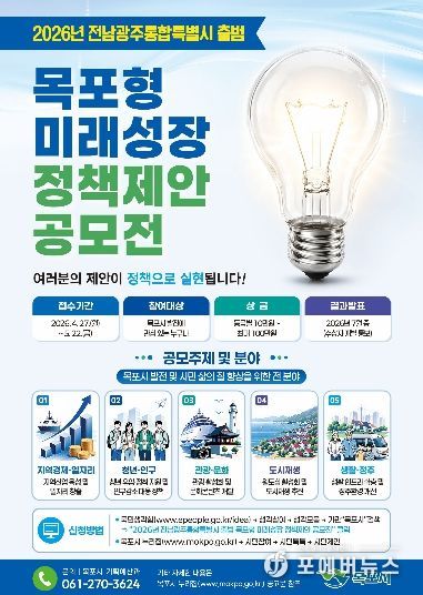 시 관계자는 “전남·광주 통합특별시 출범이라는 변화의 흐름 속에서 목포의 경쟁력을 높이고 지속가능한 성장을 이끌 정책 발굴이 중요하다”며 “참신하고 실현 가능한 정책 아이디어가 많이 제안되기를 기대한다”고 말했다.