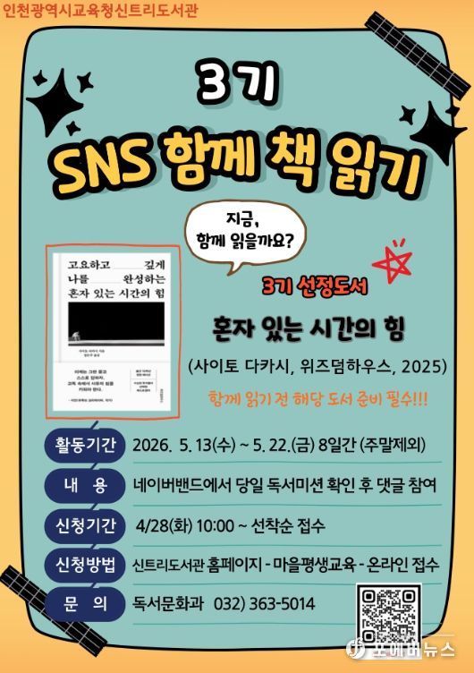 [ 포에버뉴스 김경순 기자 ] 인천광역시교육청신트리도서관은 시민의 일상 속 독서 참여를 확대하고 온라인 기반 독서 문화를 활성화하기 위해, 4월 28일부터 ‘SNS 함께 책 읽기’ 3기 참여자를 모집한다.