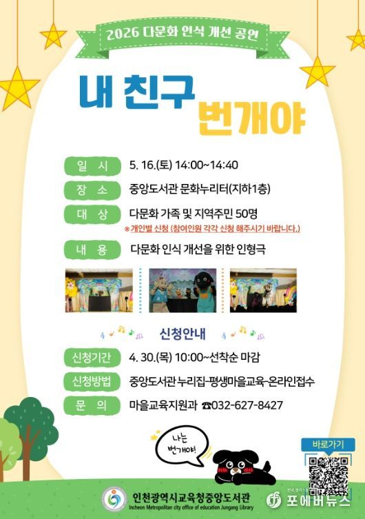 [ 포에버뉴스 김경순 기자 ] 인천광역시교육청중앙도서관은 오는 5월 16일 다문화 인식 개선 공연 ‘내 친구 번개야’를 운영한다.