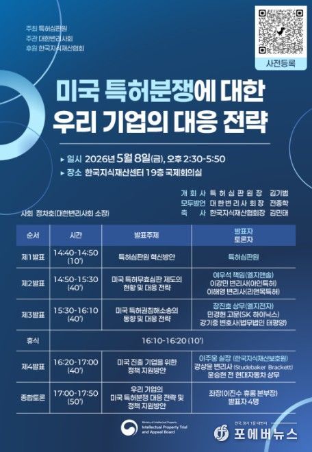[ 포에버뉴스 사공선 기자 ] 지식재산처 특허심판원은 5월 8일 14시 30분 한국지식재산센터(서울 강남구)에서 우리 기업의 미국 특허분쟁 대응 역량 강화를 위해 '미국 특허분쟁에 대한 우리 기업의 대응전략' 발표회를 개최한다고 밝혔다.
