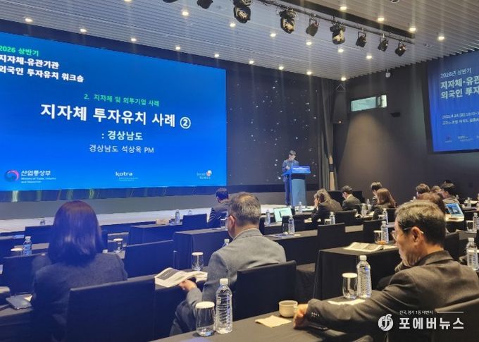 [ 포에버뉴스 사공선 기자 ] 경상남도는 24일 서울 여의도 글래드호텔에서 산업통상부와 대한무역투자진흥공사(KOTRA)가 공동 개최한 ‘2026년 상반기 지자체·유관기관 외국인투자유치 워크숍’에 참석해 외국인 투자유치 협력체계를 강화하고 경남 투자환경을 소개했다고 밝혔다.
