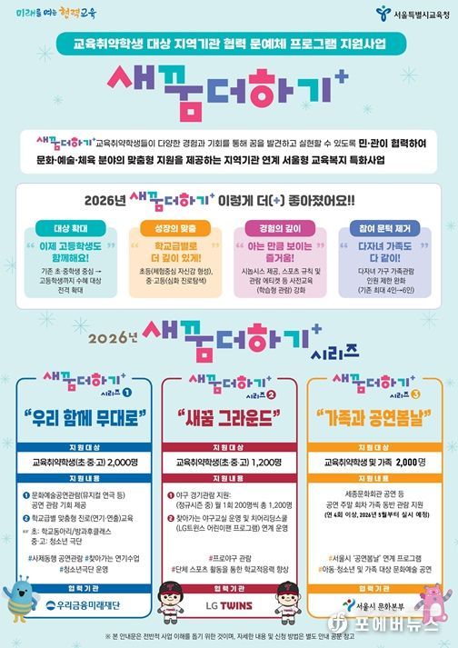 [ 포에버뉴스 김경순 기자 ] 서울특별시교육청은 교육취약학생에게 문화·예술·체육 및 진로탐색 기회를 제공하는 민관협력 교육복지 사업 ‘새꿈더하기’를 2026년 더욱 확대 운영한다고 밝혔다.