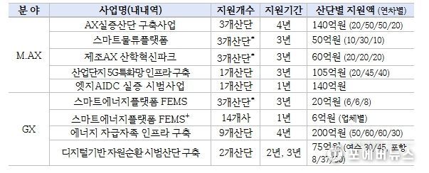 산업부는 2019년부터 현재까지 24개 산업단지를 스마트그린산단으로 지정했으며, 스마트그린산단을 대상으로 AX 실증산단 구축, 에너지 자급자족 인프라 구축 등 산업단지의 M.AX와 GX를 위한 스마트그린산단 지원사업을 추진 중이다.